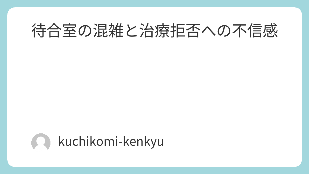 できるなら予約制にして、来る人数をコントロールする。 待合室の外(エレベーターホール)にも椅子などを置かせてもらう。しかし共有スペースになると思うので、ビル側にも了承を得てから。 寒い時期には外にも暖房家電を置いておく。 対応が難しい状態の患者さんに、なぜ治療が難しいのか、今後どうすればいいのか、順を追って分かるように説明を必ずしてほしいです。(もちろん普段取り組んでいるかもしれないが)再度徹底して、来ている患者さんを安心させてほしいなと思いました。
