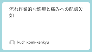 クチコミ研究® 流れ作業的な診療と痛みへの配慮欠如 流れ作業的な診療と痛みへの配慮欠如❌ 1、あなたが過去ネット上に書き込んだ(または書き込みそうになった)病院や歯科医(美容クリニック含む)の悪いレビュー・口コミ内容を具体的に教えてください。先日、虫歯治療で通い始めた歯医者の口コミを書きそう... 2026.04.02 クチコミ研究®